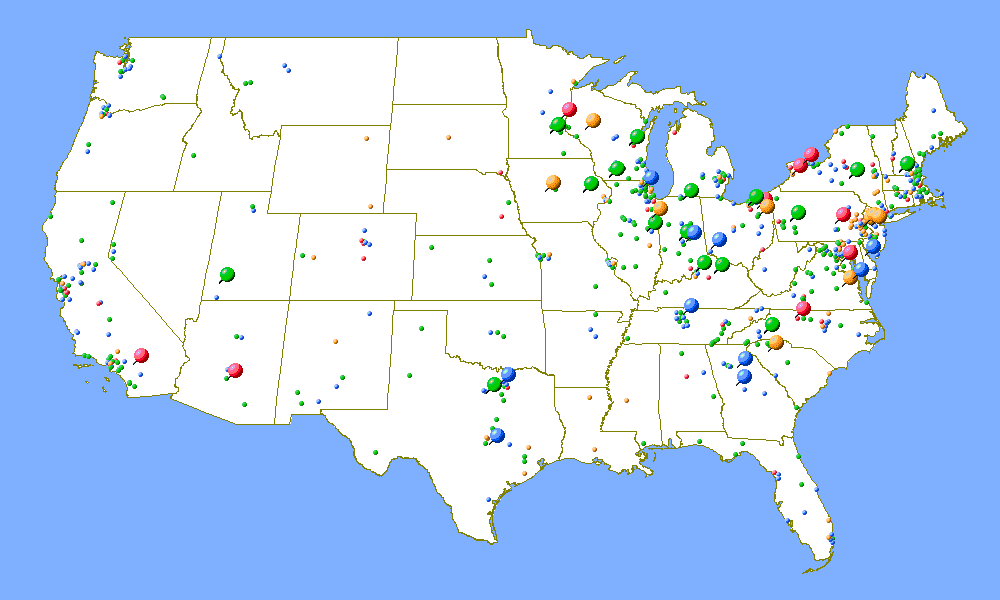 The following maps were generated from the ARRL's online contest database of results for the 2001 ARRL 160 Meter Contest. Callsigns are matched up to ZIP codes using the FCC database, which are then matched up to latitude and longitude (which means that two stations in the same ZIP code will be given the exact same latitude and longitude values.) The mapping software I used only does maps the United States of America, so these maps are limited to only U.S. contestants. Furthermore, these maps only represent U.S. contestants that submitted a log to the ARRL after the contest. There are certainly many more stations across the country who operate the contest, but do not send in their logs.