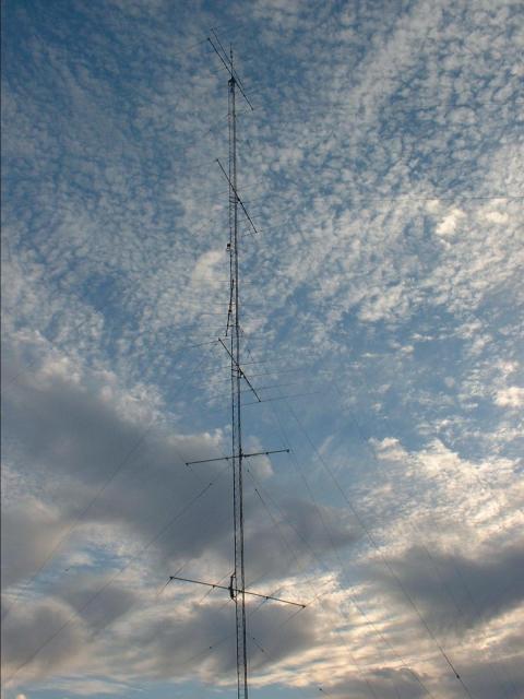 A view of the top of the 20 meter tower. Just below the frame is a Cushcraft XM510 five-element monobander for 10 meters that was installed on Tuesday before the contest. |