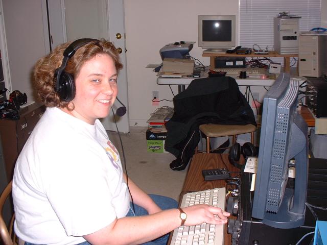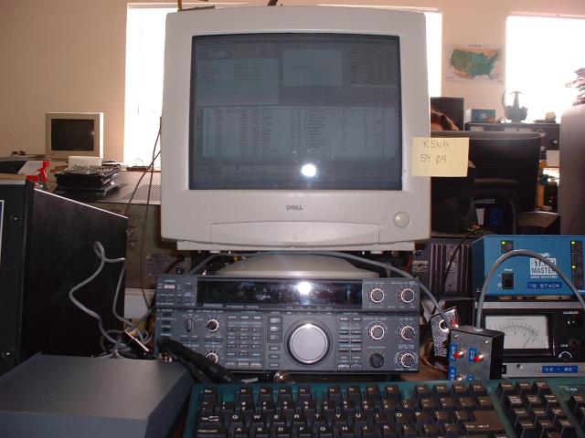 Scott Pederson KI5DR on 10 meters around 2000 UTC Sunday. The head poking above the monitor is Robert Brandon K5PI on 20 meters. |