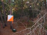 Transmitter MOS was located on top of a hill, north of the start. The transmitters were in surplus 30 caliber ammunition cases. Each case included a 7Ah gel cell battery, power cabling with an ATC blade-type fuse inline, a Realistic HTX-202 HT set to low power transmit (one watt output,) and a Byonics PicCon transmit controller. The box is locked with a padlock and was chained to a tree. The antennas were WB6DRV crossed-dipole turnstile designs using aluminum arrow shafts trimmed to length for the radiating elements. Each site had the standard orienteering control flag and a paper punch. The transmitter case and the control flag both have labels with the transmitter ID. |